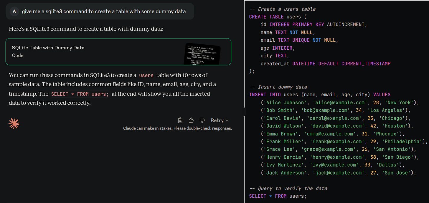 On to creating a table! I went to the claude ui to ask it how to create a table because as mentioned I do not know how to sql and I am very lazy.