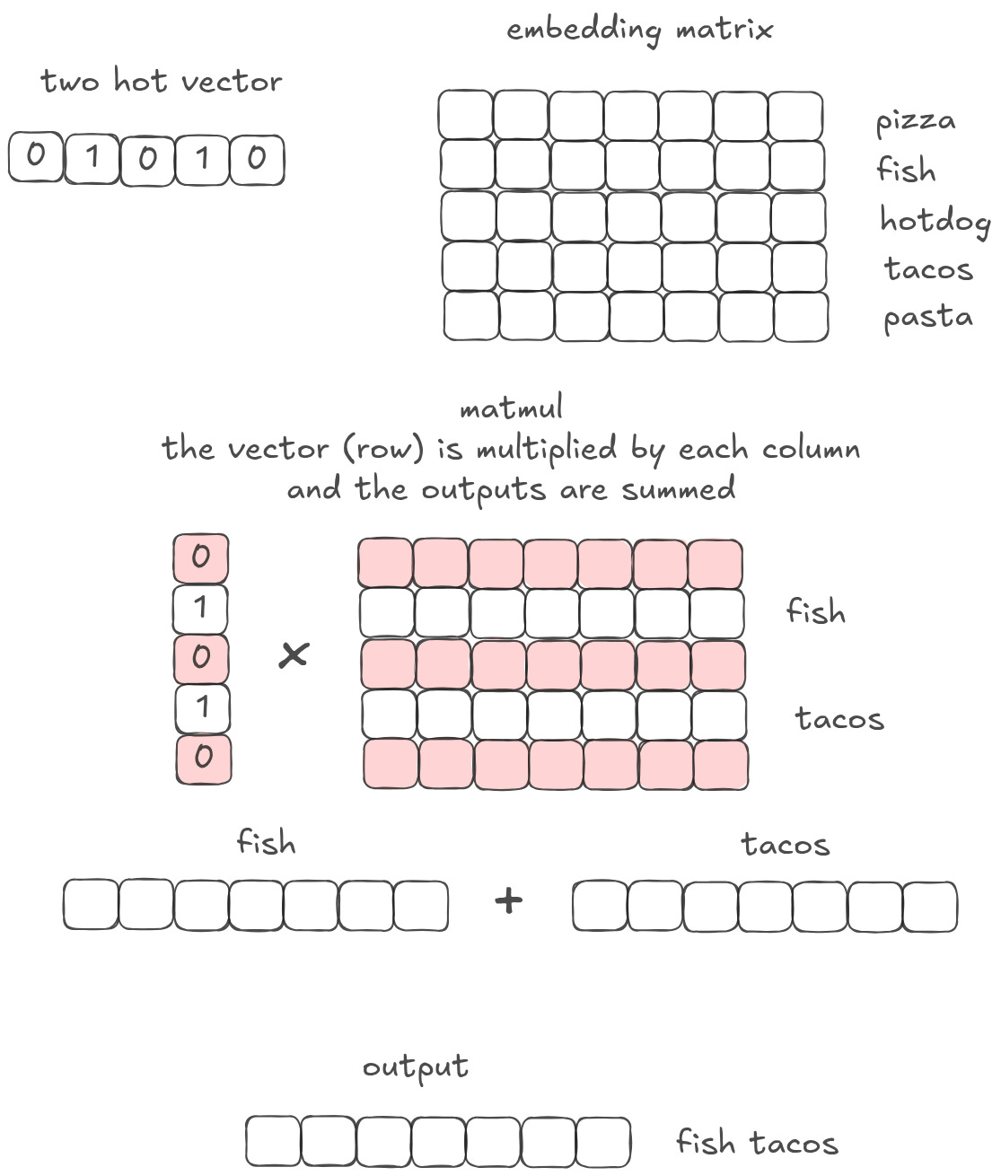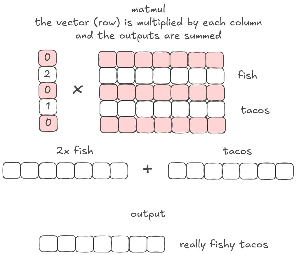 Follow the linear algebra: when you do a matrix multiplication, you multiply the vector by each column, and then you sum the result. Remember what we said about summing vectors earlier? A sum is simply mixing two concepts together. So if I have a matrix multiplication with a two-hot vector, with a one on the ‘fish’ dimension and a 1 on the ‘tacos’ dimension, I will get a ‘fish tacos’ vector out. I do a lookup AND mixing in the same operation.