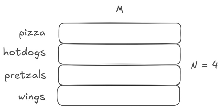 In the above image, N is the number of concepts you care about, and M is the length of the vectors assigned to each concept. You can think of M as the ‘representational capacity’ of the concepts. The larger M is, the more nuanced the concepts can be. If M is small, you may be able to represent car vs bus vs bicycle. If M is large, you may be able to get more nuanced, representing Mercedes and BMW.