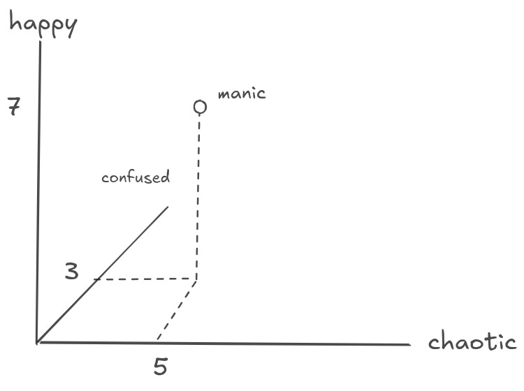 What is an emotion or word that is 7 parts “happy”, 5 parts “chaotic”, 3 parts “confused”, and 1 part “doubtful”? ChatGPT came up with manic. Which, as a weighted summary of that database, isn’t actually that far off! Depending on what is important, you may weight the database differently to get different outputs that represent different things.