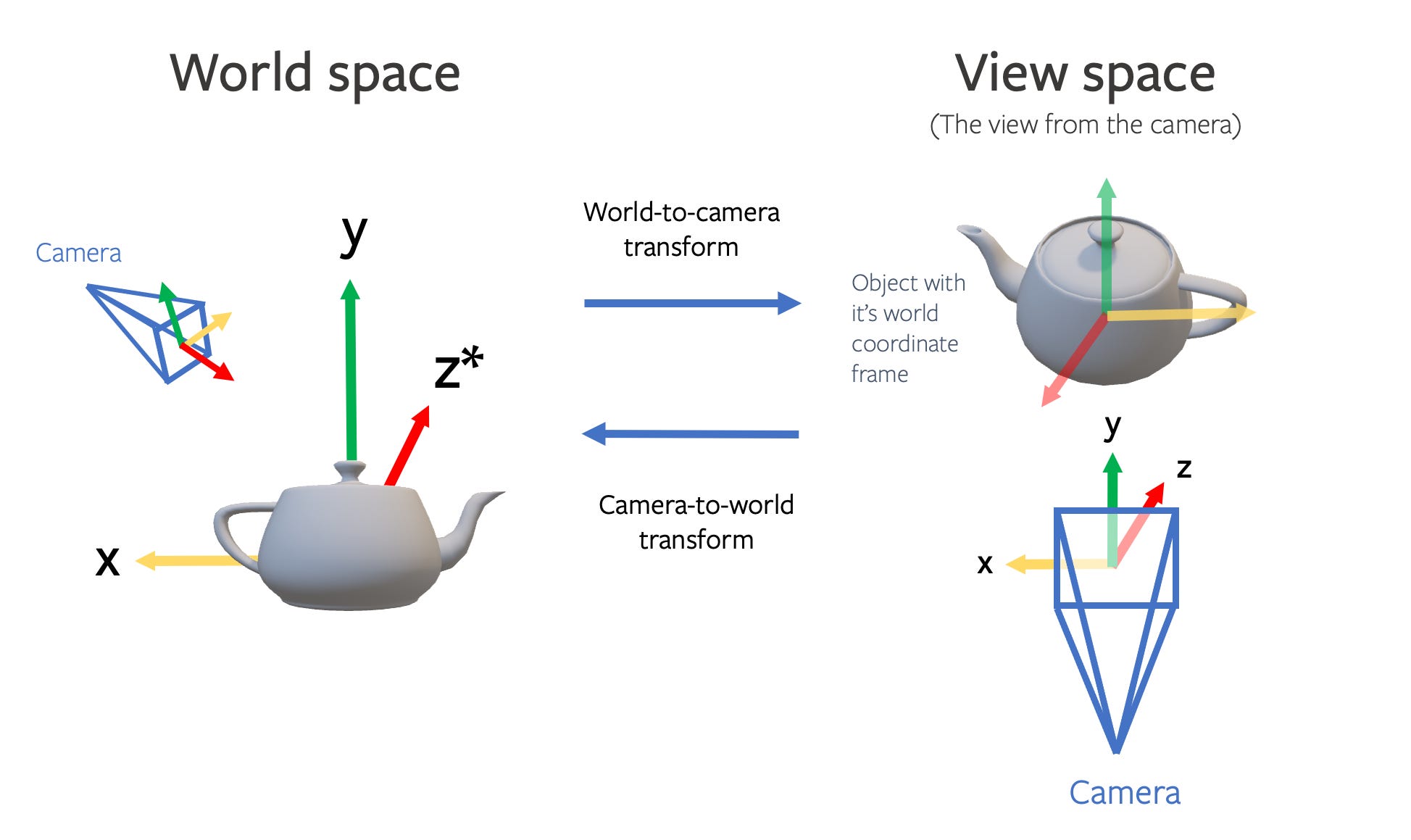 A core part of making 3D games is placing objects in your game world. At a technical level, you have to tell your code what coordinate to place each object. But this is a funny question — coordinates relative to what? If I have a box at point [0, 0, 1], where is the box actually located? In most game engines, the box is given a coordinate that is relative to a fixed arbitrary [0, 0, 0] point. This is called ‘world space’. But then, when the game is actually being played, the engine needs to recalculate all of those locations relative to the position of the player’s camera. This is called ‘camera space’.