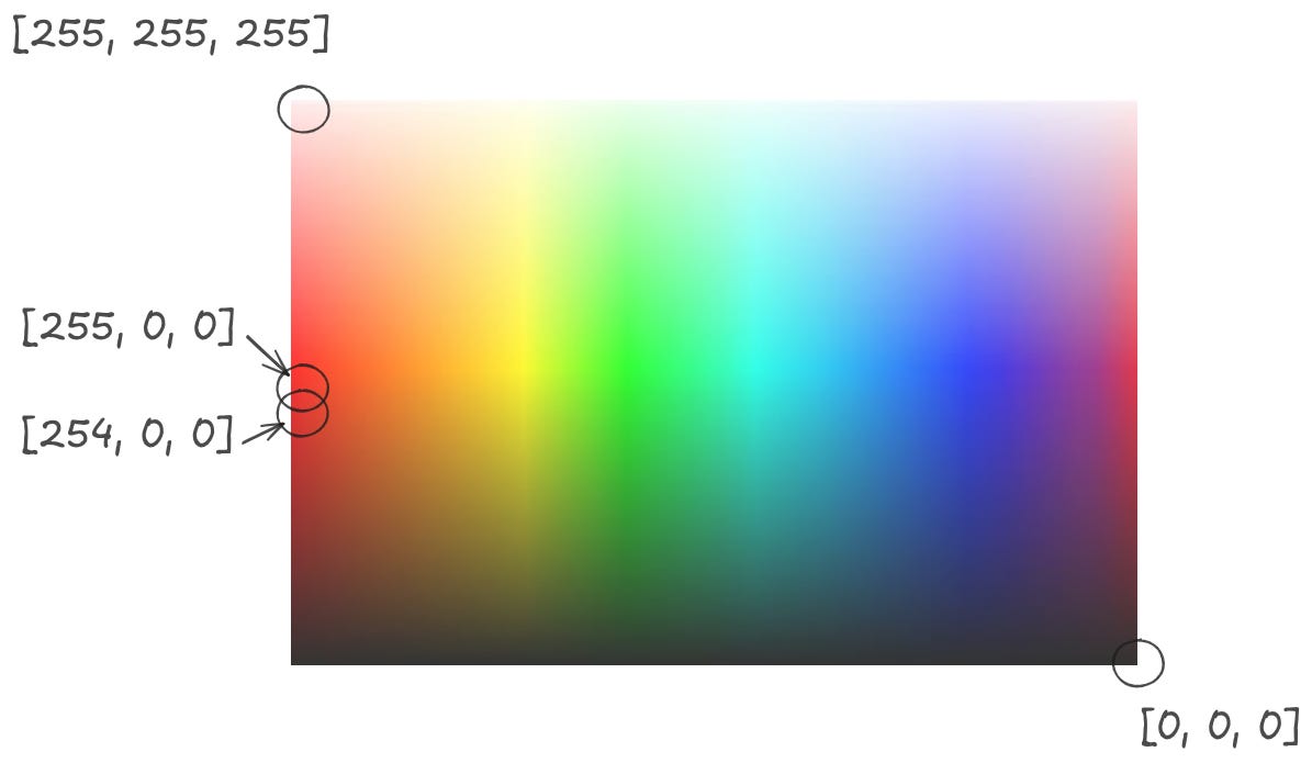 RGB vectors that are near each other — say [255, 0, 0] and [254, 0, 0] — are nearly indistinguishable. Vectors that are far from each other — say, [0, 0, 0] and [255, 255, 255] — look totally different.
