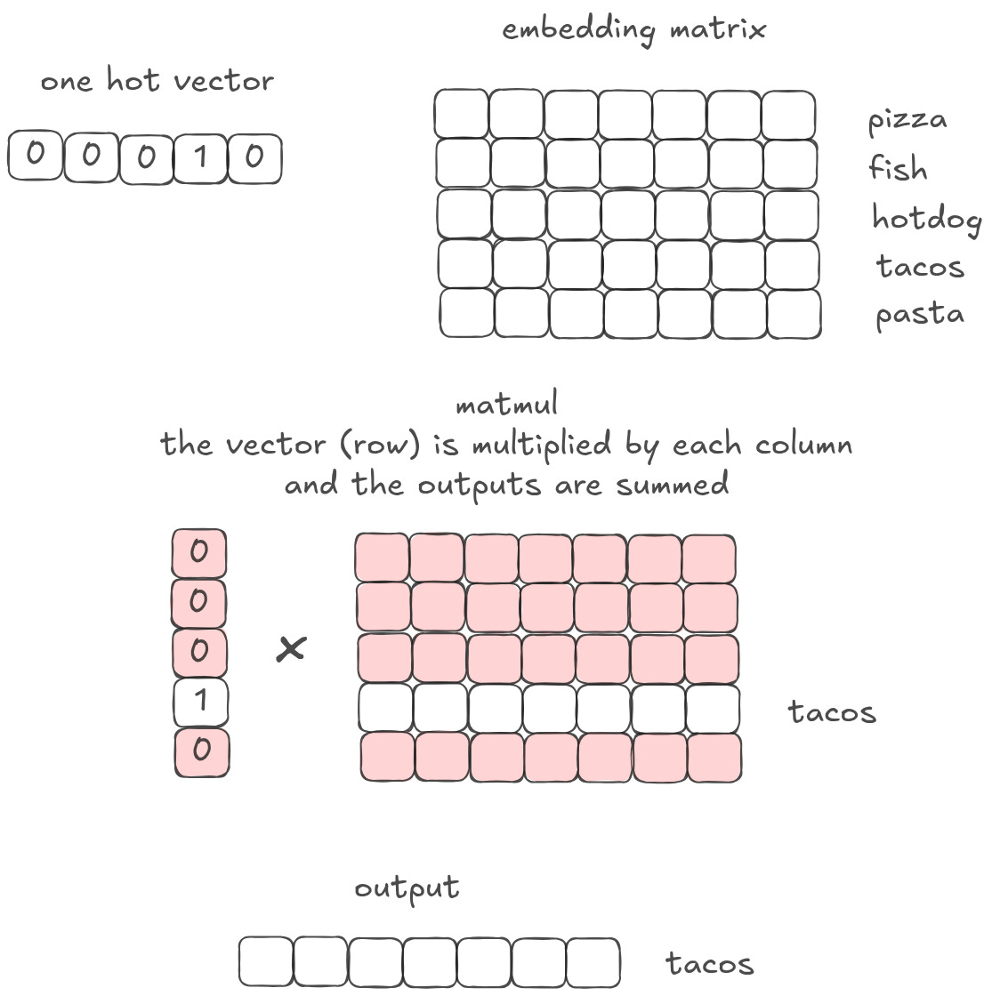 This is just an array indexing operation. You are using your one-hot lookup vector to ‘query’ a ‘database’ of other vectors.5 That database can be arbitrarily large. For example, it can be the size of the entire token vocabulary that a model is working with. The database can also store arbitrary information. Every matrix instantiation is essentially a bunch of variable assignments. In the example above, we assign each vector to a specific food. But in practice, those vectors could represent anything from paragraphs to documents to songs you may like on Spotify to potential matches on Hinge.