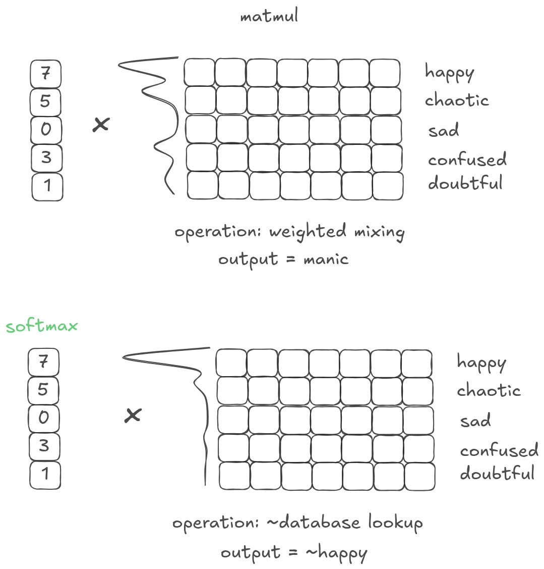 This is all really fuzzy. There is no mathematical rigor here. I’m grasping at intuitions that I have, not formal proofs. Also, to make things worse, multiple operations are implemented the exact same way! How do you know when you are doing a weighted summary of a database or changing a representation of a vector? They are both vector * matrix matrix multiplications!