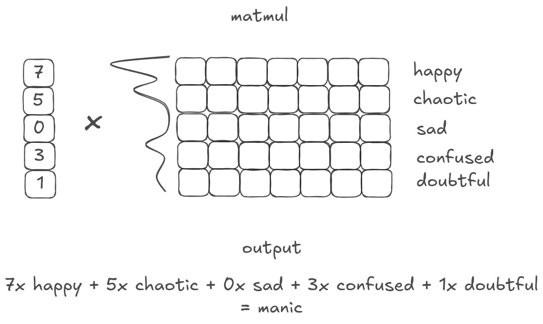 What if, instead of having only a few values, I have a vector full of different values? When I matmul that vector with a matrix of embeddings, I am collapsing all of the matrix representations into a single, weighted output. Or, in other words, I am creating a ‘weighted summary’ of the original matrix.6