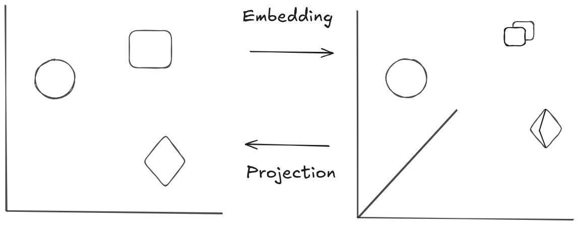 You can generalize this concept to cases where you are adding and removing dimensions. In the former, you are “embedding” your vector in a higher dimensional space; in the latter, you are “projecting” it down to a lower dimensional space. And in the process of embedding up or projecting down, you can rotate the representation or “change its shape”.