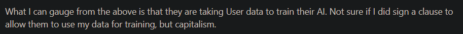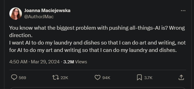 You know what the biggest problem with pushing all-things-AI is? Wrong direction. I want AI to do my laundry and dishes so that I can do art and writing, not for AI to do my art and writing so that I can do my laundry and dishes.